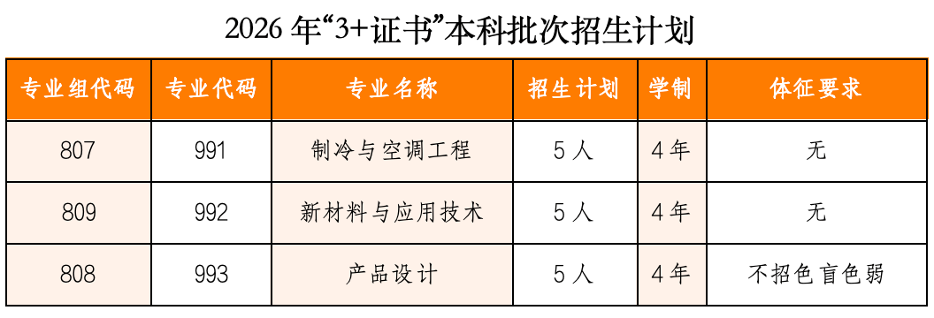 顺职大“3+证书”测验本科批次招生登科专业为制冷取空调工程、新材料取使用手艺产物设想,共招生15人。